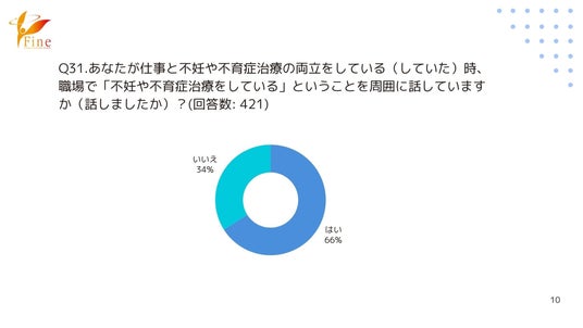 - 職場で「不妊や不育症治療をしている」ということを周囲に話している人は66%、話していない人は34%でした(Q31)。<グラフ8>