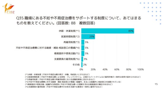 - - 一番多かったのは、休暇・休職制度の充実でした。具体的には、「不妊治療のための特別休暇や休職制度の導入」「半休や時間有給の制度の充実」「夜勤の免除」などがありました。