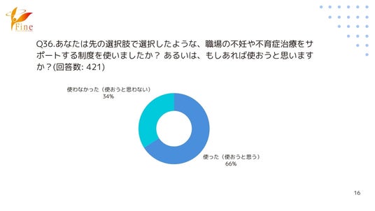 - 職場に不妊や不育症治療をサポートする制度等があれば「使った(使おうと思う)」人は66%でした(Q36)。<グラフ14>