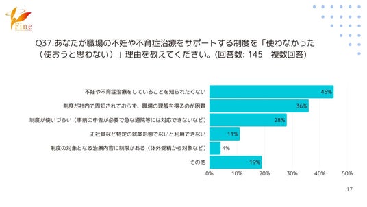 - 「使わなかった(使おうと思わない)」と回答した人(34%)の理由は、「不妊や不育症治療をしていることを知られたくない」(45%)、「制度が社内で周知されておらず、職場の理解を得るのが困難」(36%)、「制度が使いづらい(事前の申告が必要で急な通院等には対応できないなど)」(28%)でした(Q37)。<グラフ15>