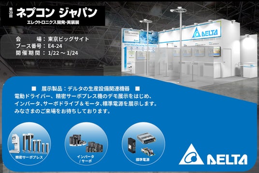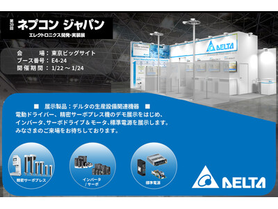 デルタ電子株式会社(代表者:華 健豪)は、2025年1月22日(水)より東京ビッグサイトで開催されるアジア最大級のエレクトロニクス開発・実装展 ネプコンジャパン 2025へ出展いたします。(出展する構成展示会:エレクトロテスト ジャパン)デルタグループの提案する電子部品製造工場へ向けた製品として、精密サーボプレス機、電動ドライバーDCSS+SCARAのデモ展示を行うとともに、自動化装置に欠かせないインバータ/サーボ製品、各種標準電源を展示いたします。皆様のご来場をお待ちしております。