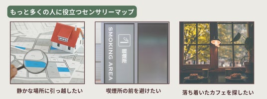 センサリーマップは、感覚過敏の方だけでなく、さまざまな場面で利用できます。たとえば、引っ越し先を選ぶ際に静かな場所や騒音が少ないエリアを探したい方。また、タバコのニオイが苦手な方が、喫煙所の前を避けるために利用することもできます。さらに、落ち着いて作業したいカフェを探したり、リラックスできる環境を求める方にとっても、有益な情報を提供します。