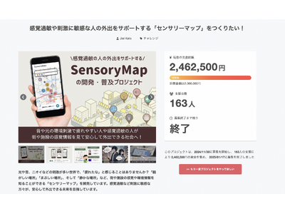 感覚過敏研究所を運営する株式会社クリスタルロード(本社:東京都中央区、代表:加藤路瑛)は、2024年11月30日~2025年1月17日まで、感覚過敏の方の外出をサポートするセンサリーマップの開発・運営費を集めるためのクラウドファンディングを実施し、163名から2,462,500円の支援をいただきました。