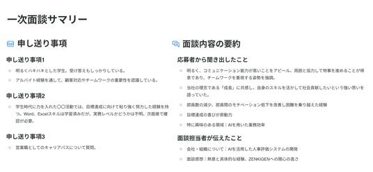 応募者が提出した自己PR動画をAIが解析し、「自己PR」「志望動機」などのジャンルごとに分類・要約します。これにより、評価者は動画を閲覧する前に内容を把握でき、選考を効率的に進めることが可能となります。