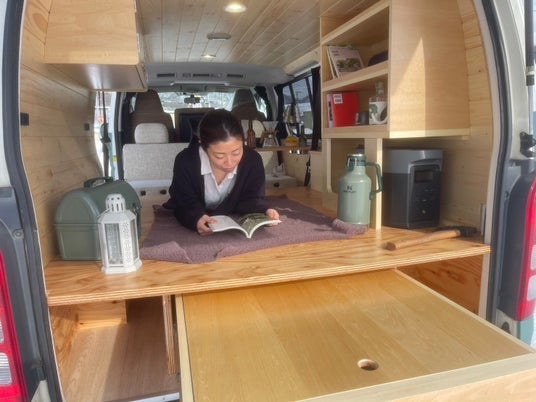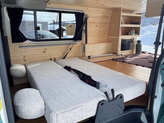 車内は主に道産木材で制作。建築現場で出た端材などを利用したり、ベース車両を中古で仕入れることが可能なため、従来のキャンピングカーよりもリーズナブルな価格でのご提供が可能です。