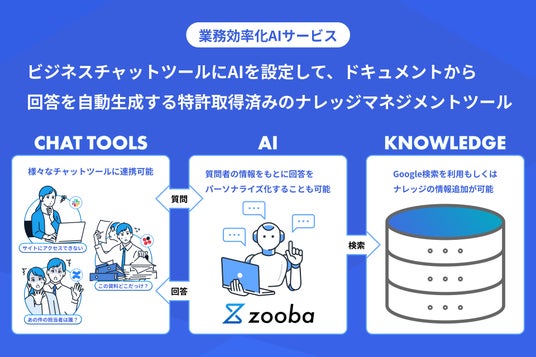 株式会社zoobaは、テクノロジーを活用して働く人々が自らの能力を最大限に発揮し、組織のあらゆるレベルでイノベーションを促進して、ビジネスに持続的な価値をもたらすことを目指しています。情報システムの業務効率化AIサービス「zooba」は、Slack、TeamsなどのビジネスチャットツールにAIを設定して、社内ドキュメントから回答を自動生成する特許取得済みのナレッジマネジメントツールです。質問者の役職や部署、使用デバイス、アプリ情報をもとに回答をパーソナライズすることも可能です。社内問い合わせ窓口を一元化することで、企業の情報システム部門がより効率的に業務を遂行でき、組織全体の生産性と競争力の向上、また持続的な成長を実現する革新的なサービスとして注目されています。