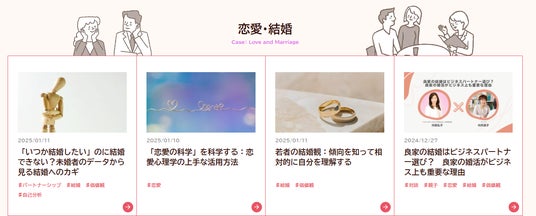 1tonariメディアでは、「恋愛・結婚」、「夫婦・パートナー」、「キャリア・職場」、「親子・家族」、「隣人・友人」の5つのカテゴリに分けて、記事を発信しています。