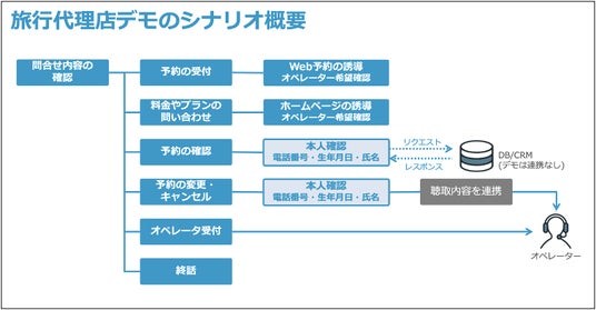 旅行代理店の電話窓口を想定したデモ環境を用意しています。トライアル専用のWeb無料通話インターフェースから電話をかけると、ボイスボットによる自動応対が始まります。オペレーターへの接続を希望した場合、専用窓口への接続に切り替わりますが、トライアル環境のためオペレーターへは接続せず、そのまま終了となります。