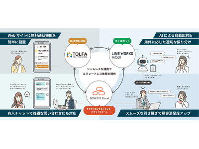 エス・アンド・アイ株式会社(東京都港区 代表取締役社長:藤田和夫、以下、S&I)は、Web無料通話インターフェース「TOLFA」、ボイスボット「LINE WORKS AiCall」、AI搭載のエクスペリエンス・オーケストレーション・プラットフォーム「Genesys Cloud(TM)」を連携しました。このソリューションにより、顧客はデジタルサポートチャネルから音声ベースのサービス体験へとシームレスに移行でき、よりシンプルでつながりのあるオムニチャネルエンゲージメントの実現と、より迅速で満足度の高い問題解決が可能になります。これを契機に、多くのお客さまにオンラインサポートと電話窓口の境界を意識させないコンタクトチャネルを体験いただくために、本日から無料トライアル環境の提供を開始します。