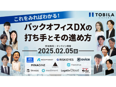 株式会社イノベーション(東証グロース 証券コード3970)のグループ会社である、株式会社Innovation & Co(本社:東京都渋谷区、代表取締役社長:齊藤和馬、以下「Innovation & Co」)は、トビラシステムズ株式会社(本社:愛知県名古屋市、代表取締役社長:明田 篤、証券コード:4441、以下「トビラシステムズ」)と共催で、2025年2月5日( 水)に、これをみればわかる!「バックオフィスDXの打ち手とその進め方」を開催することをお知らせいたします。