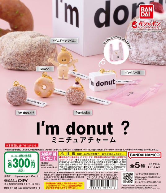 株式会社バンダイ ベンダー事業部(本社:東京都台東区)は、株式会社peace put(本社:福岡市中央区)が展開する大人気の生ドーナツ専門店「I'm donut?」(アイムドーナツ)のドーナツのミニチュア4種と、お店のマスコットキャラクター「アイムドーナツくん。」のマスコットがラインアップされた『I'm donut? ミニチュアチャーム』(1回300円・税10%込、全5種)を 2025年1月第4週より全国のガシャポンバンダイオフィシャルショップ、玩具売場、量販店、家電店などに設置されたガシャポン自販機シリーズにて発売いたします。