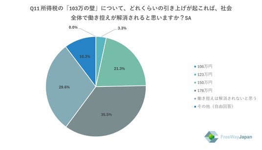 所得税の「103万の壁」について、どれくらいの引き上げが起これば、社会全体で働き控えが解消されると思うか聞いたところ、「178万円」が35.5%、「働き控えは解消されないと思う」が29.6%、「150万円」が21.3%、「123万円」が3.3%、「106万円」は0.0%、その他は10.3%という結果だった。