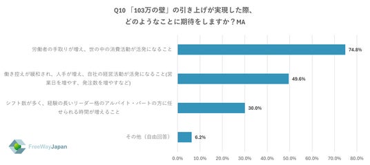 Q8で「賛成」と答えた方に、「103万の壁」の引き上げが実現した際、どのようなことに期待をするか聞いたところ、「労働者の手取りが増え、世の中の消費活動が活発になること」が74.8%、「働き控えが緩和され、人手が増え、自社の経営活動が活発になること(営業日を増やす、発注数を増やすなど)」が49.6%、「シフト数が多く、経験の長いリーダー格のアルバイト・パートの方に任せられる時間が増えること」が30.0%、その他が6.2%という結果だった。