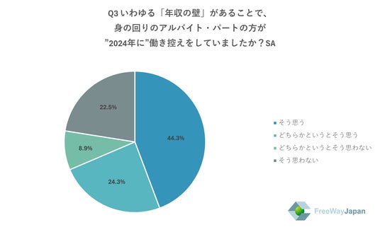 Q1、もしくはQ2で「はい」と回答した方に、いわゆる「年収の壁」があることで、身の回りのアルバイト・パートの方が”2024年に”働き控えをしていたか聞いたところ、「そう思う」が44.3%、「どちらかというとそう思う」が24.3%、「そう思わない」が22.5%、「どちらかというとそう思わない」が8.9%という結果だった。