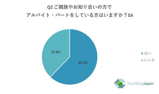 親族や知り合いの方でアルバイト・パートをしている方はいるか聞いたところ、「はい」が62.2%、「いいえ」が37.8%という結果だった。