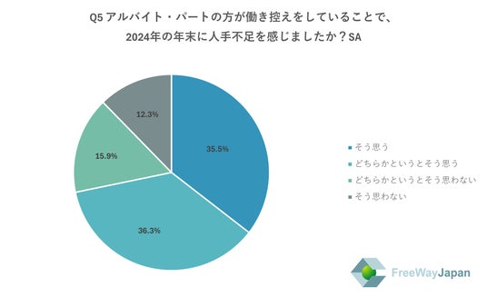 Q1で「はい」、且つQ3で「そう思う」「どちらかというとそう思う」と答えた方に、アルバイト・パートの方が働き控えをしていることで2024年の年末に人手不足を感じたか聞いたところ、「どちらかというとそう思う」が36.3%、「そう思う」が35.5%、「どちらかというとそう思わない」が15.9%、「そう思わない」が12.3%という結果だった。