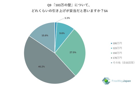 Q8で「賛成」と答えた方に、「103万の壁」についてどれくらいの引き上げが妥当だと思うか聞いたところ、「178万円」が46.2%、「150万円」が27.5%、「123万円」が9.6%、「106万円」が1.1%、その他が20.0%という結果だった。