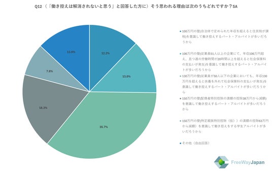 上記で「働き控えは解消されないと思う」と回答した方に、そう思う理由は選択肢のうちどれか聞いたところ、「130万円の壁(従業員が50人以下の企業においても、年収130万円を超えると扶養を外れて社会保険料の支払いが発生)を意識して働き控えするパート・アルバイトが多いだろうから」が35.7%、「150万円の壁(配偶者特別控除の満額の控除38万円から減額)を意識して働き控えするパート・アルバイトが多いだろうから」が18.3%、「106万円の壁(従業員51人以上の企業にて、年収106万円超え、且つ週の労働時間が20時間以上を超えると社会保険料の支払いが発生)を意識して働き控えするパート・アルバイトが多いだろうから」が13.0%、「100万円の壁(自治体で定められた年収を超えると住民税が課税)を意識して働き控えするパート・アルバイトが多いだろうから」が12.2%、「150万円の壁(特定親族特別控除(仮))の満額の控除63万円から減額)を意識して働き控えをする学生アルバイトが多いだろうから)」が7.8%、その他が13.0%という結果だった。