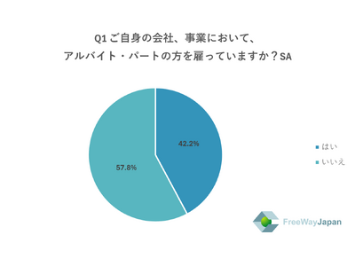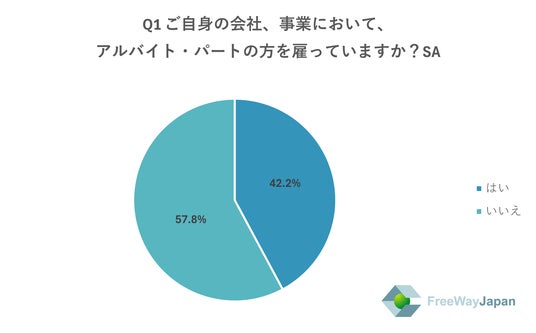 自身の会社、事業において、アルバイト・パートの方を雇っているか聞いたところ、「いいえ」が57.8%、「はい」が42.2%という結果だった。