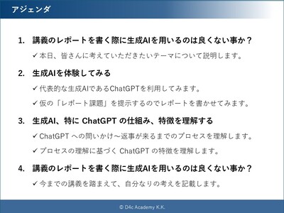 株式会社D4cアカデミー(本社:東京都中央区、代表取締役:和田陽一郎)は、長崎大学の学生に向けて情報教育の一環として、生成AI時代の学習活用に関するレクチャーを実施しました。