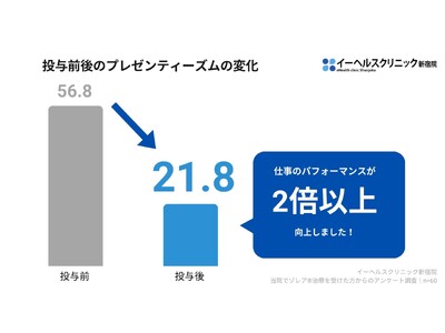イーヘルスクリニック新宿院での調査結果として、プレゼンティーズム(出勤しているが本来のパフォーマンスが発揮できない状態)が大幅に改善し、患者満足度や治療継続意欲が非常に高いことが明らかになりました。