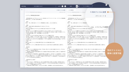 今回の機能追加で、「MNTSQ CLM」上に取り込まれバージョン管理された契約書ドキュメント同士を全文比較できるようになります。あわせて、WordやPDFなどの任意ドキュメント間でも比較が可能となり、契約書レビューを効率的かつ正確に進められるようアシストします。
