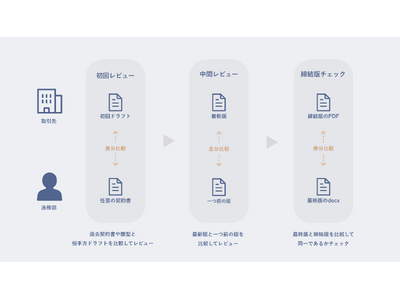 異なるファイルやフォーマット間でも全文比較ができるので、過去の類似契約から新契約への修正点や、法務部がレビューした最終版ドラフトファイルと事業部が作成した締結版PDFとの差分把握も非常に簡単になります。これにより、任意の契約同士であっても確認・修正作業に要する時間が大幅に削減されるとともに、契約プロセスにおいて予期しない内容が反映されてしまうリスクを低減できます。
