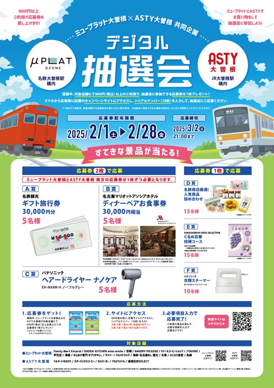 名鉄プロパティマネジメント株式会社(代表取締役社長 小野猛)が運営するミュープラット大曽根(名鉄大曽根駅構内)と、名古屋ステーション開発株式会社(代表取締役社長 伊藤裕次)が運営するASTY大曽根(JR大曽根駅構内)では、JR線と名鉄線の結節点である大曽根駅エリアの賑わい創出や両施設の相互利用を促進するため、共同販促を以下の内容で実施します。