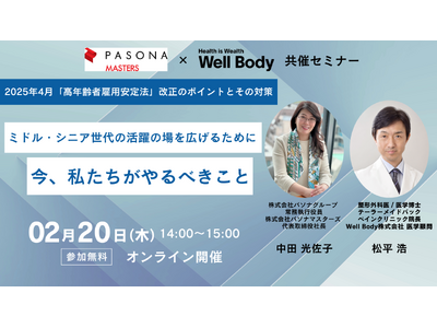 株式会社パソナマスターズとWell Body株式会社は、経営者および健康経営推進、総務、人事ご担当者を対象に、共催セミナー『ミドル・シニア世代の活躍の場を広げるために今、私たちがやるべきこと』を2月20日(木)にオンラインにて開催いたします。
