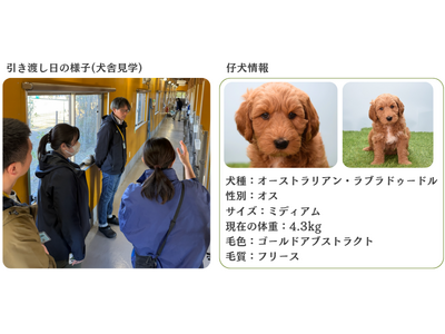 株式会社レイクウッズガーデン(本社:東京都千代田区、代表取締役社長:寺田剛)と公益財団法人日本盲導犬協会(本社:神奈川県横浜市港北区、理事長:金高雅仁)のパートナーシップ協定に基づき、2025年1月13日、茂原事業所(ALブリーディング施設)にて、オーストラリアン・ラブラドゥードル(以下、AL)1頭の引き渡しが行われました。今後、盲導犬訓練プログラムを経て、盲導犬としての適性が評価されます。