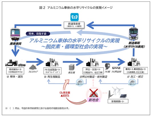 今回、通勤車両における廃車車体の水平リサイクルの実現により、特に強度が必要となる車両構体の一部等へリサイクル材の使用用途を広げることで将来的な鉄道事業におけるCO2サプライチェーン排出量のさらなる削減を目指し、覚書を締結した各社で連携し、本共同研究を実施することとしました。