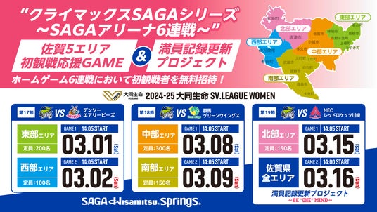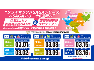 SAGA久光スプリングスは3月に開催されるホームゲームSAGAアリーナ6連戦を"クライマックスSAGAシリーズ"と名付け、初観戦者を無料招待する「佐賀5エリア初観戦応援GAME」、そして最終日に「満員記録更新プロジェクト」を実施します。