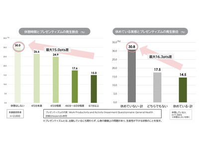 プレゼンティズムの発生割合が低くなり、労働生産性にポジティブな影響が確認された。逆に、休憩しない人や休めていない実感がある人では、