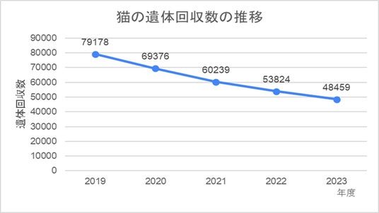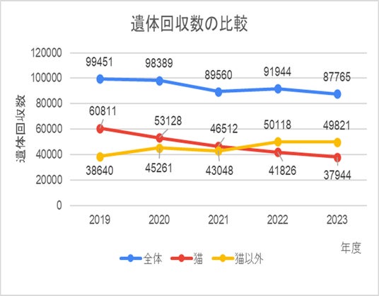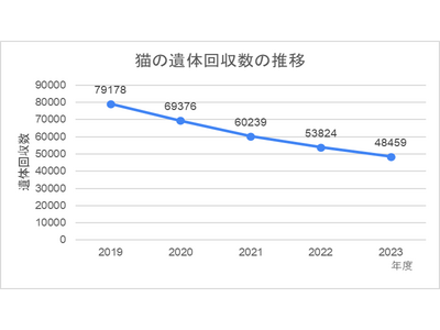 猫のロードキル数年に79,178頭だった猫の回収数は、2023年には48,459頭に減少(37.5%減少)。10万人あたりの回収数は102.7頭で、これを基に推計すると全国の回収数は127,730頭に上ります。