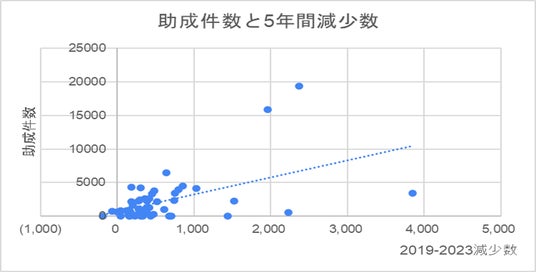 避妊去勢助成制度の影響飼い主のいない猫への助成制度がある自治体では、助成制度のない自治体に比べてロードキル数の減少率が高く、また、助成件数が多いほど減少率が大きいという傾向が確認された。