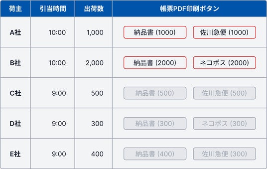 帳票発行やデータ出力は全荷主を1つのダッシュボードから一括で印刷することができます。