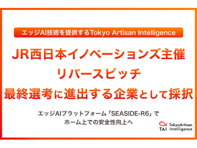 Tokyo Artisan Intelligence株式会社(本社:神奈川県横浜市、代表取締役:中原啓貴(CEO,CTO)、岡安一将(COO)、以下:TAI)は株式会社JR西日本イノベーションズ(本社:大阪市北区、代表取締役社長:川本 亮)が実施したリバースピッチ「ホーム上のお客様と列車の衝突防止」の募集テーマにおいて、最終選考に採択されたことをお知らせいたします。