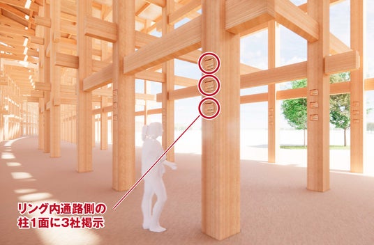 シンボルである「大屋根リング」の柱に個人名や企業名、未来に向けたメッセージ