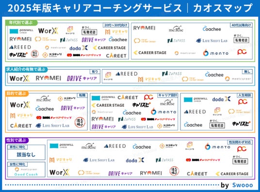 Swoooのキャリアを運営する合同会社ゼロイチスタート(本社:東京都中央区)は、「2025年度 キャリアコーチングサービスカオスマップ」を公開しました。