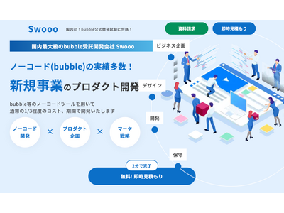 ノーコード受託開発「Swooo」は、「コーディング不要のノーコードツールbubbleを活用し、従来よりもコストを抑え、そして早く実現させる」webシステム開発サービスです。