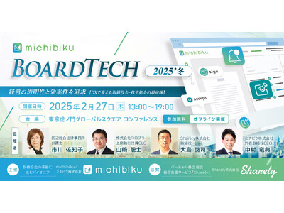 “コーポレートガバナンス・テック”で「経営を、あるべき姿へ導く。」ミチビク株式会社(本社:東京都中央区、代表取締役CEO 中村 竜典)は、「取締役会のDX」をテーマにしたカンファレンス「BoardTech 2025’冬」を2025年2月27日(木)に開催いたしますので、お知らせいたします。