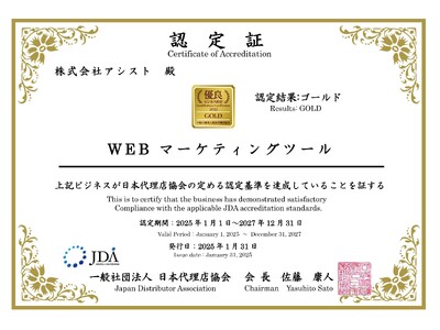 WEBシステムやAI機能の開発、SEO対策やMEO対策、WEB制作やSNS集客支援からサポートまでをワンストップで提供する株式会社アシスト(本社:東京都千代田区、代表取締役:宇井和朗以下、アシスト)が、2025年1月31日、一般社団法人日本代理店協会が主催する「優良ビジネス認定2025」において、最高位であるゴールド認定を受賞したことをお知らせします。