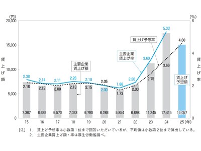 全回答者485人の平均で「1万5057円・4.60%」(定期昇給分を含む)となった。賃上げ率は24年実績より下回るも高水準の予測。労使別に見た平均値は、労働側1万5384円・4.70%、経営側1万4856円・4.54%で、労働側が経営側を528円・0.16ポイント上回る。