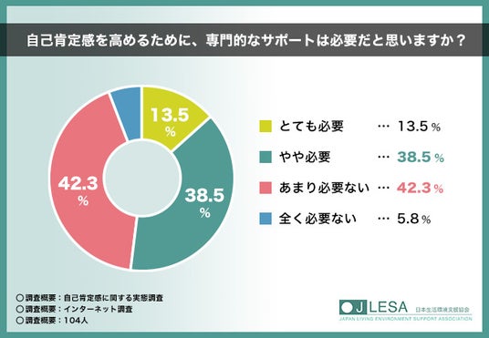 最後に「自己肯定感を高めるために、専門的なサポートは必要だと思いますか?」と質問したところ、「あまり必要ない」と回答した方が42.3%と最も多くなっています。次いで「やや必要」が38.5%と続き、意見が二分される結果となりました。
