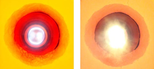 バーナ正面写真(左:都市ガス 100%、右:アンモニア 100%)いずれも円状の火炎で安定燃焼していることが確認できる