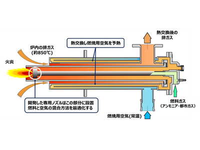 燃焼用空気の温度が高いほど燃焼速度が速くなる特性から、炉内の排熱をバーナ本体で熱交換し、燃焼用空気を予熱するバーナの特長を活用するとともに、開発した専用ノズルで燃料ガスと空気の混合方法を最適化することで、燃焼量50kWにおいて0~100%という幅広いアンモニア混焼率での安定燃焼を実現しました。