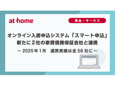 不動産情報サービスのアットホーム株式会社(本社:東京都大田区 代表取締役社長:鶴森 康史 以下、アットホーム)は、賃貸物件の入居申込をオンライン上で行える「スマート申込」において、新たに株式会社Sumapla(本社:東京都渋谷区 代表者:宮坂 哲二)、フォーシーズ株式会社(本社:東京都港区 代表者:丸山 輝)と連携し、2025年1月末現在で連携実績が全56社となりましたことをお知らせいたします。