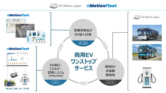 ・EVM-Jが開発・販売する商用EV、充電器、蓄電池と、eMotion FleetのFMS/EMSを組み合わせ、バス・物流事業者向けのトータルソリューションを提供