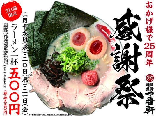 株式会社ベスト・モア(所在地:愛知県、代表取締役:三木規翔)が運営するラーメンブランド「一番軒」は、日頃のご愛顧に感謝を込めて、2025年2月19日(水)~21日(金)の3日間限定で「一番軒感謝祭」を開催いたします。