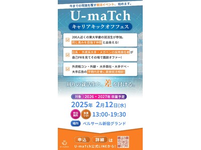 株式会社AUTLA(U-maTch)は、2025年2月12日(水)に「U-maTchキャリアキックオフフェス vol.1」を開催します。参加予定学生は27卒中心の東大早慶一橋生150人、参加企業は大手企業から今急成長中のベンチャーまで多岐に渡る10社程度の予定です。